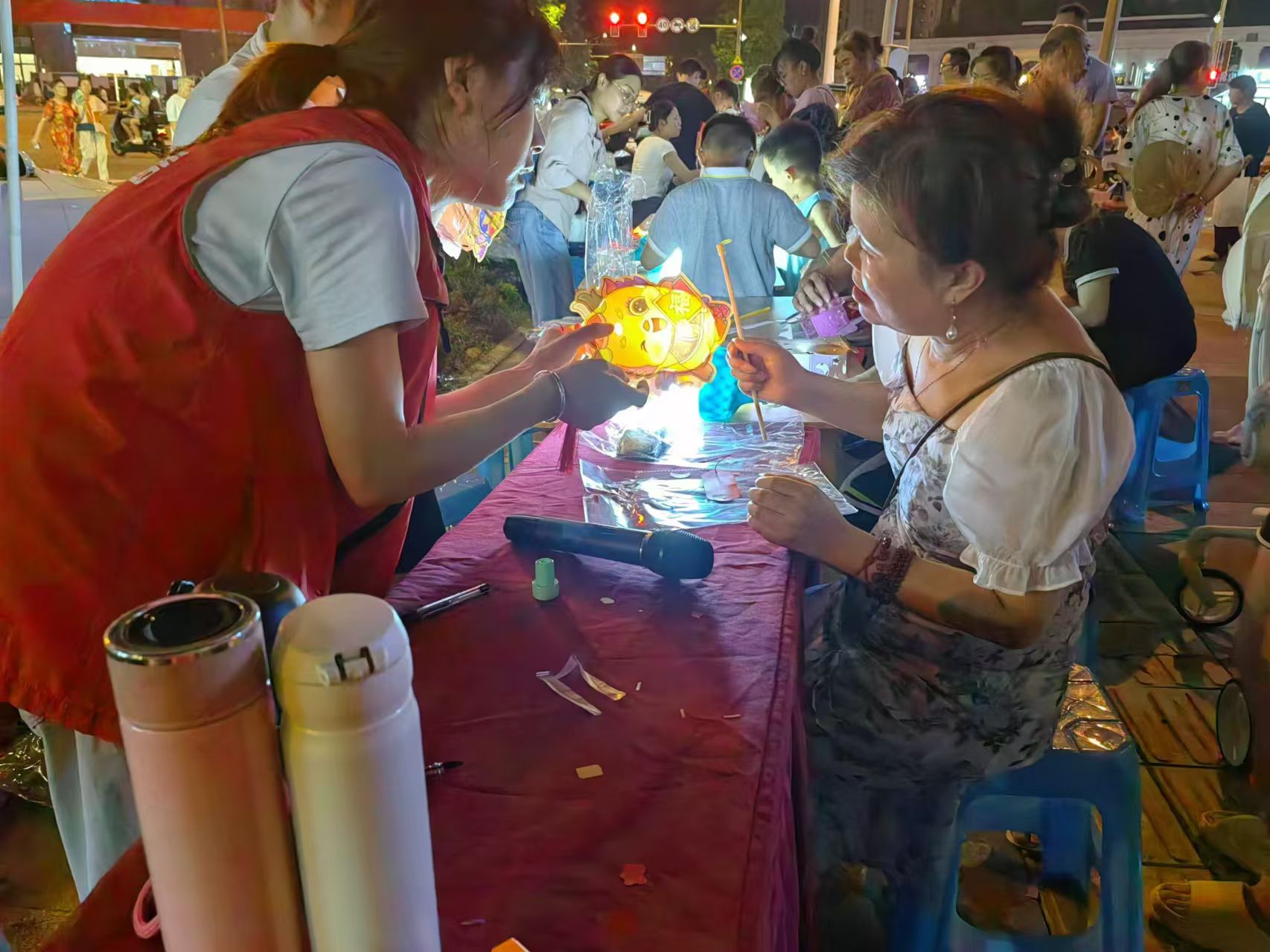 居民们在老师的指导下,纷纷拿起手中的材料,开始认真地制作花灯。大家有的裁剪纸张,有的组装花灯,忙得不亦乐乎。在制作过程中,大家互相交流、互相帮助,共同探讨制作花灯的技巧和方法。